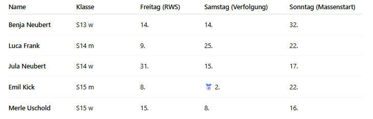 👉 Besonders Emil Kick glänzte mit einem starken 2. Platz im Verfolgungsrennen der Schülerklasse 15 männlich. Auch Benja Neubert, Luca Frank, Jula Neubert und Merle Uschold konnten mit konstanten Leistungen an allen drei Tagen überzeugen und wichtige Erfahrungen auf nationaler Ebene sammeln.