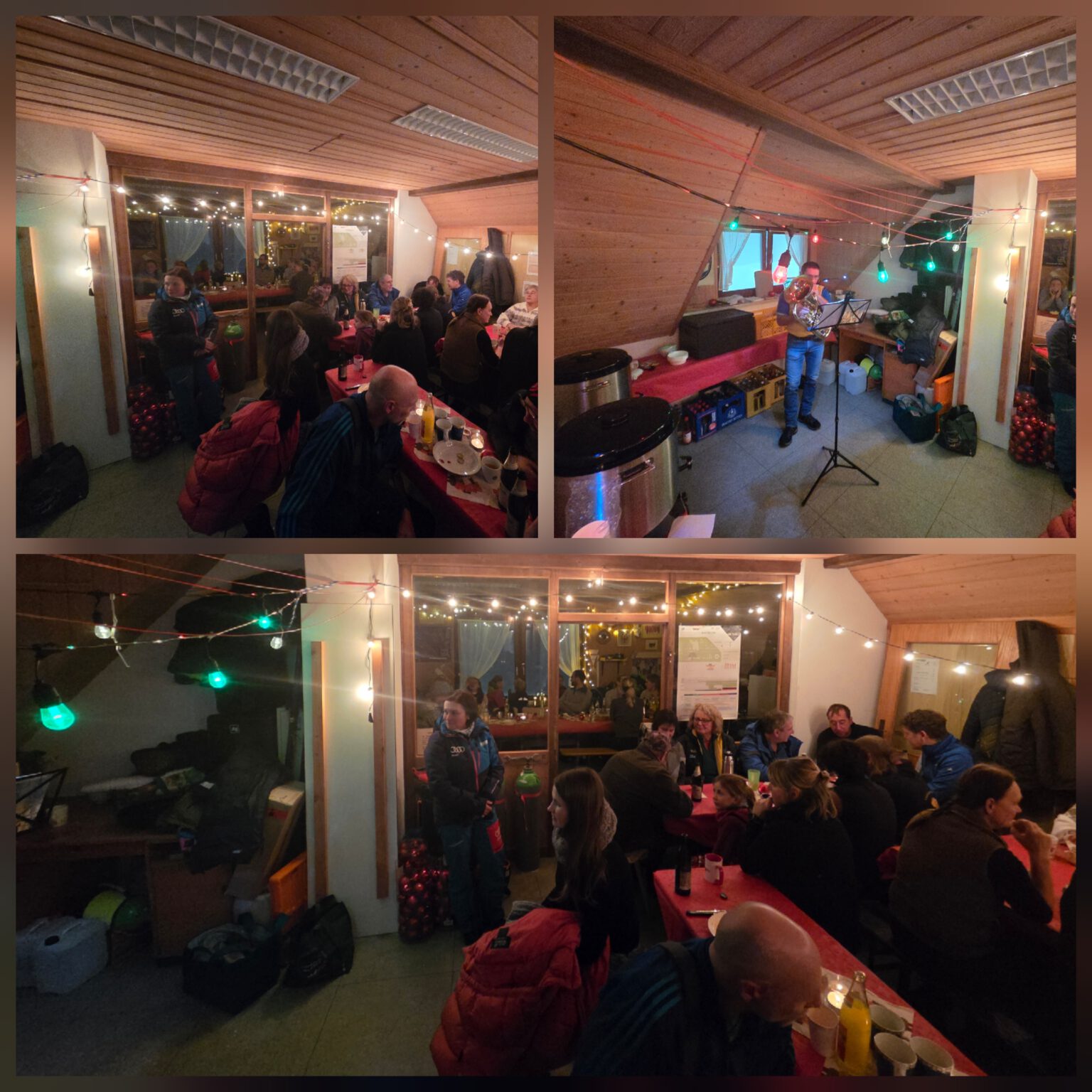 Schon am frühen Abend duftete es nach Schaschliktopf und heißen Würstchen für die Kinder. Draußen brannte die Feuerschale, Glühwein und Kinderpunsch sorgten für Wärme, während die Kinder im frisch gefallenen Schnee spielten und mit Poporutschern über den Hang rutschten.